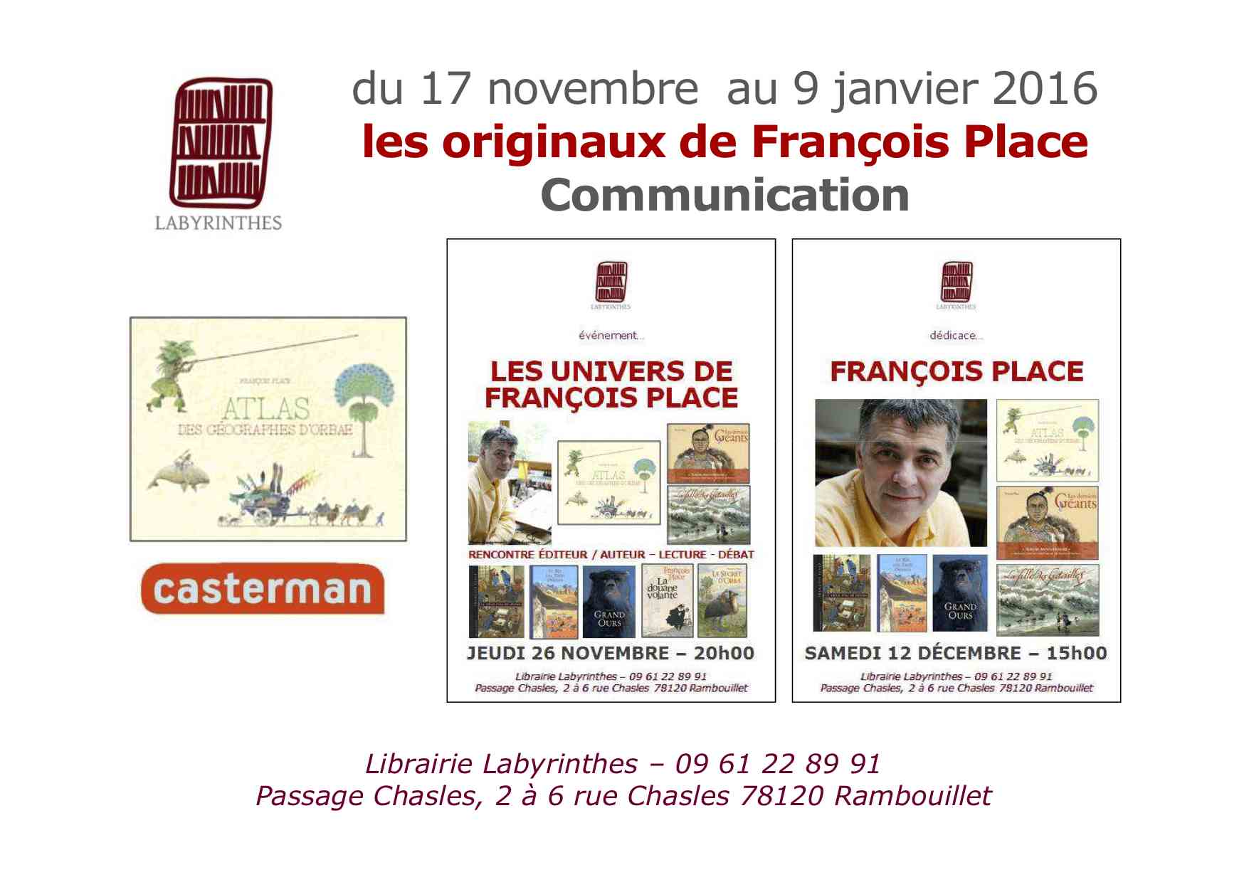 Rendez-vous à la librairie Labyrinthes François Place il y a 10 années Prochaine étape, une rencontre-lecture à 20 h jeudi prochain 26 novembre, à la librairie labyrinthes de Rambouillet. Une exposition de quatre des pays de l’atlas des géographes d’Orbae est présentée à la librairie jusqu’au 9 janvier 2016.